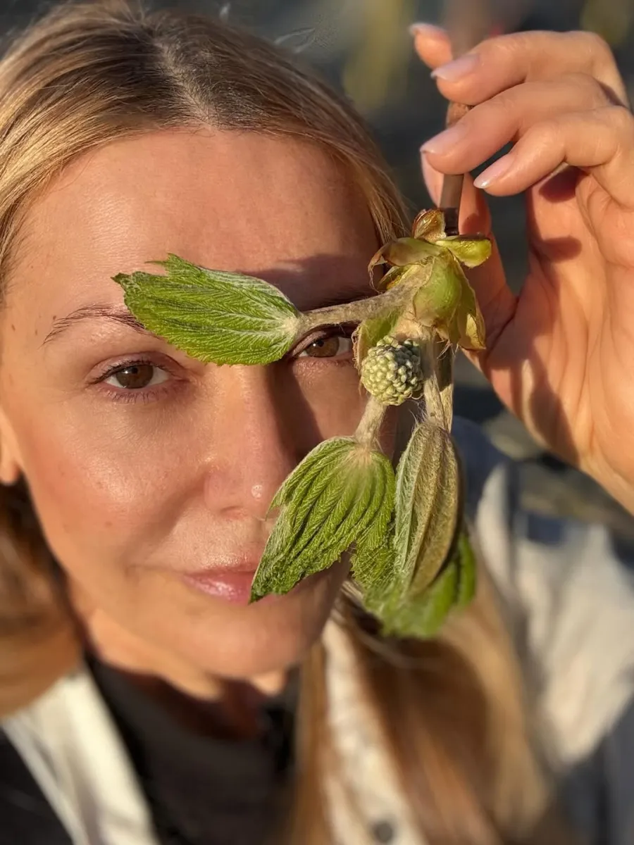 59-річна акторка сфотографувалася просто неба – поруч із гілкою каштана, який щойно випустив перші зелені листочки та бутон.