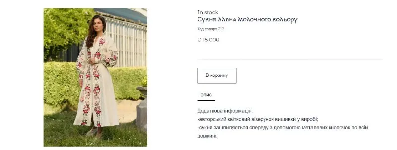 Родзинкою образу стали об’ємні манжети на довгих рукавах та традиційна квіткова вишивка. Яскраві рослинні орнаменти на передній частині сукні створюють стильний контраст із світлою тканиною, а вертикальні візерунки додають ведучій стрункості.
