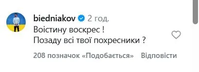 «Воістину воскрес! Позаду всі твої похресники?», – написав Бєдняков.