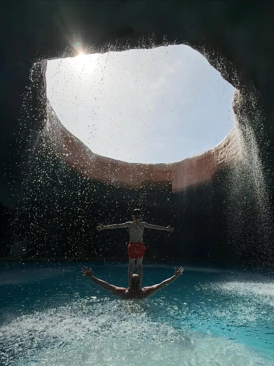 У своєму Instagram Стейтем опублікував серію фото з відпочинку в турецькому Белеку. На знімках він разом із сином Джеком та донькою Ізабеллою плаває у басейні, оформленому як штучна «печера».