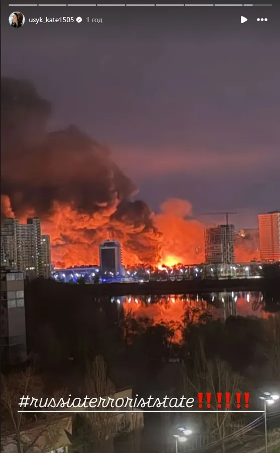 Дружина відомого українського боксера Олександра Усика Катерина оприлюднила знімок палаючої споруди, в яку влучив шахед, і додала публікацію з хештегом #russiaterroriststate.