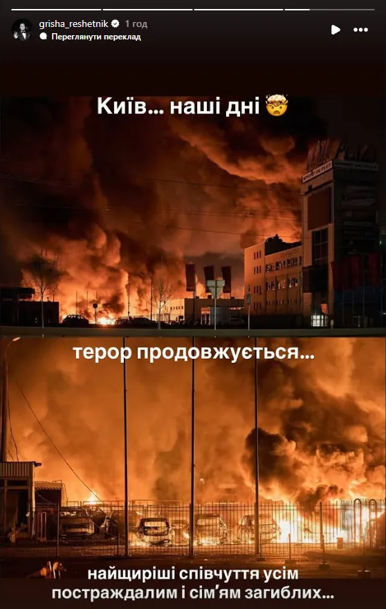 Відомий телеведучий проєкту «Холостяк» Гриша Решетнік розмістив фото пожежі, що спалахнула внаслідок влучання зброї, та підписав його: