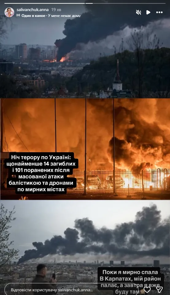 «Ніч терору по Україні: щонайменше 14 загиблих і 101 поранених після масованої атаки балістикою та дронами по мирних містах. Поки я мирно спала в Карпатах, мій район палає, а завтра я вже буду там»