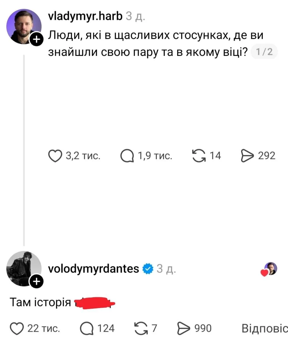 Причиною для заяви стала публікація одного з користувачів, у якій він запитав українців, де вони знайшли свою пару та в якому віці. До обговорення долучився Володимир Дантес і жартівливо написав, що історія його знайомства настільки страшна, що страшно розказувати.