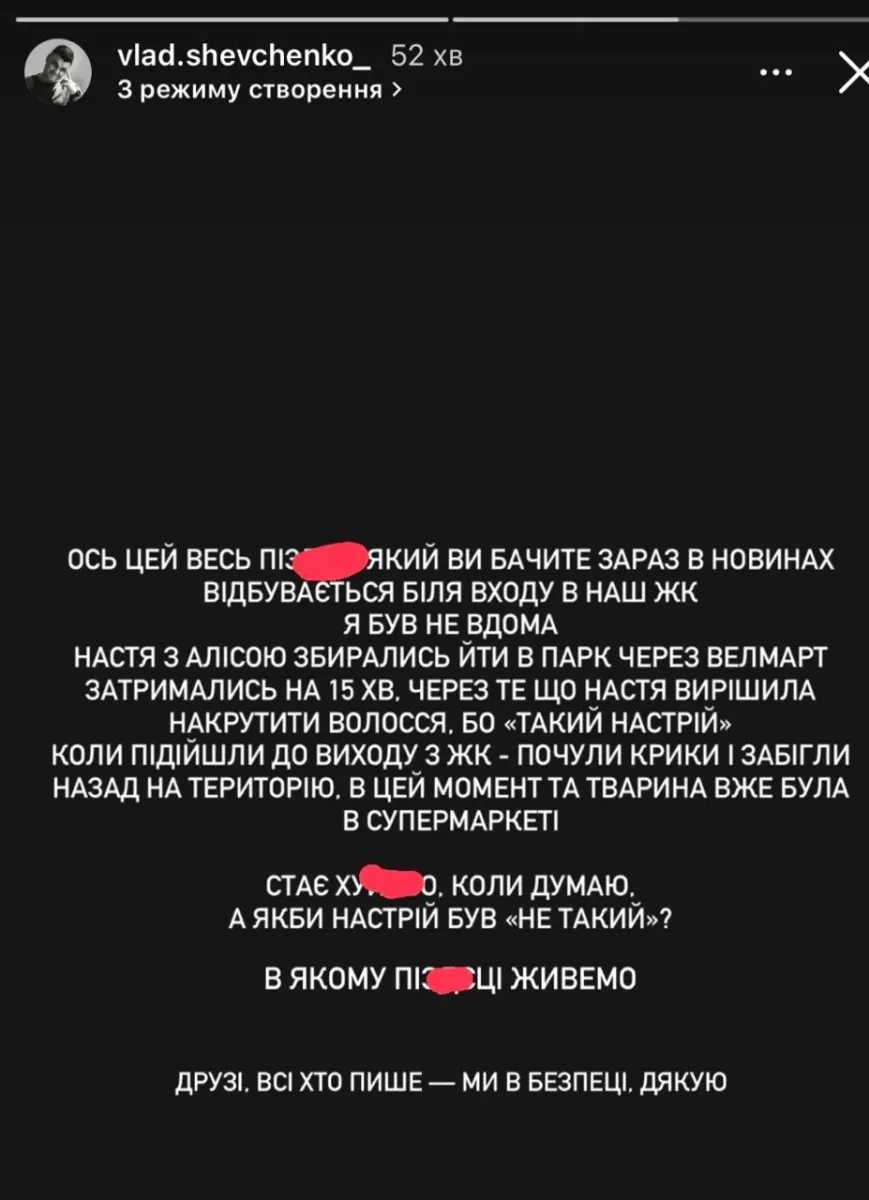 «Настя з Алісою збирались йти в парк через Велмарт. Затримались на 15 хв, через те що Настя вирішила накрутити волосся, бо «такий настрій». Коли підійшли до виходу з ЖК – почули крики і забігли назад на територію. В цей момент та тварина вже була в супермаркеті. Стає х***о, коли думаю. А якби настрій був «не таким»?»