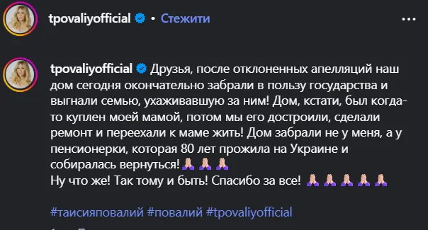 «Будинок забрали не у мене, а у пенсіонерки, яка 80 років прожила в Україні і збиралася повернутися» — цинічно написала Таїсія Повалій на своїй сторінці в Instagram.