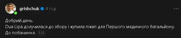 Новина про те, що світова зірка Dua Lipa допомогла зібрати кошти на пікап для Першого окремого медичного батальйону, швидко розлетілася соцмережами.
