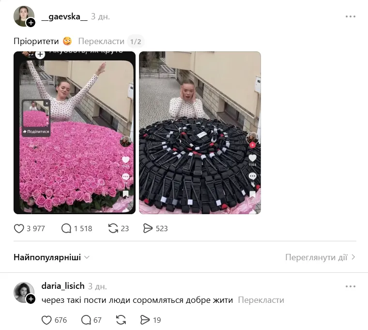 Першопричиною став допис про блогерку Юлію Вербу, яка раніше похвалилася розкішним букетом із тисячі й однієї троянди. Гаєвська відреагувала на цей жест провокативно та опублікувала згенероване штучним інтелектом фото інфлюенсерки з турнікетами та підписом «Пріоритети».