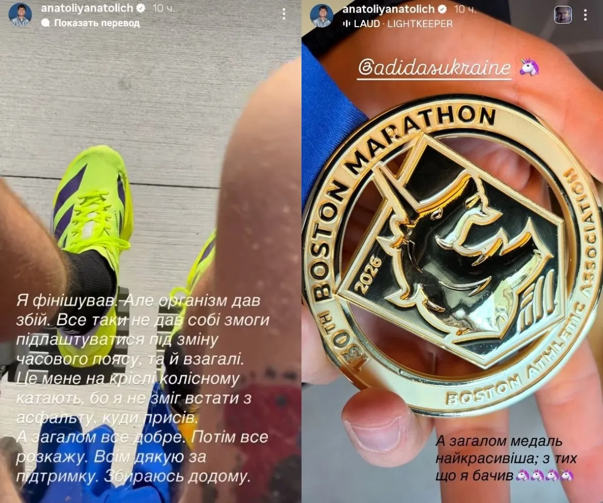 Відомий український телеведучий і шоумен Анатолій Анатоліч узяв участь у Бостонському марафоні, однак фінальні кілометри змагання обернулися для нього справжнім випробуванням. Інформацію про інцидент оприлюднила дружина шоумена у Telegram-канал.