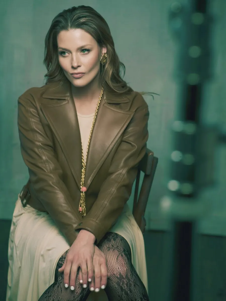 Зірка позувала на стільці та дивані біля фактурної стіни у довгій кремовій сукні з розрізами на стегнах, доповнивши образ зелено‑коричневою шкіряною курткою та гіпюровими колготками.
