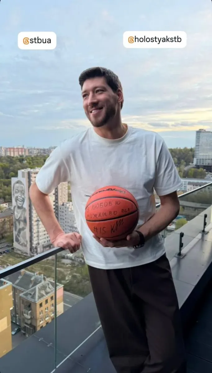 На ексклюзивній світлині баскетболіст стоїть на балконі та тримає у руках баскетбольний м'яч на якому зворушливо написані слова про любов.