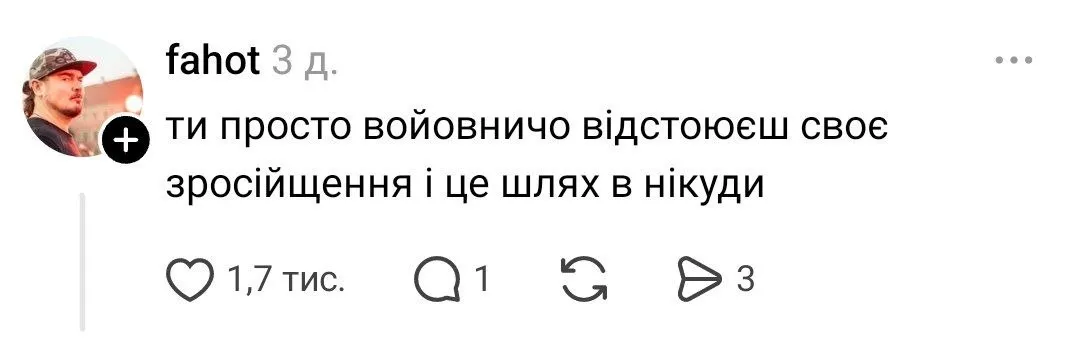 Реакція фоловерів також була неоднозначною. Хоча знайшлися ті, хто намагався нагадати Бєднякову про його роботу в минулому, більшість українців стали на бік критиків. Користувачі намагалися пояснити артистці, що «київська російська» – це не діалект, а наслідок тривалої русифікації, якої варто позбуватися.