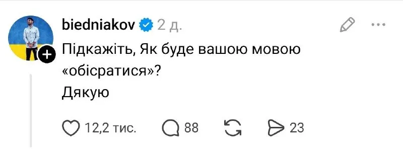 «Підкажіть, як буде вашою мовою "обісратися". Дякую», – написав телеведучий Андрій Бєдняков.