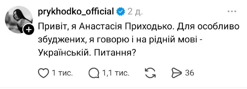 «Привіт, я Анастасія Приходько і я говорю київською російською мовою. Запитання?», – написала виконавиця
