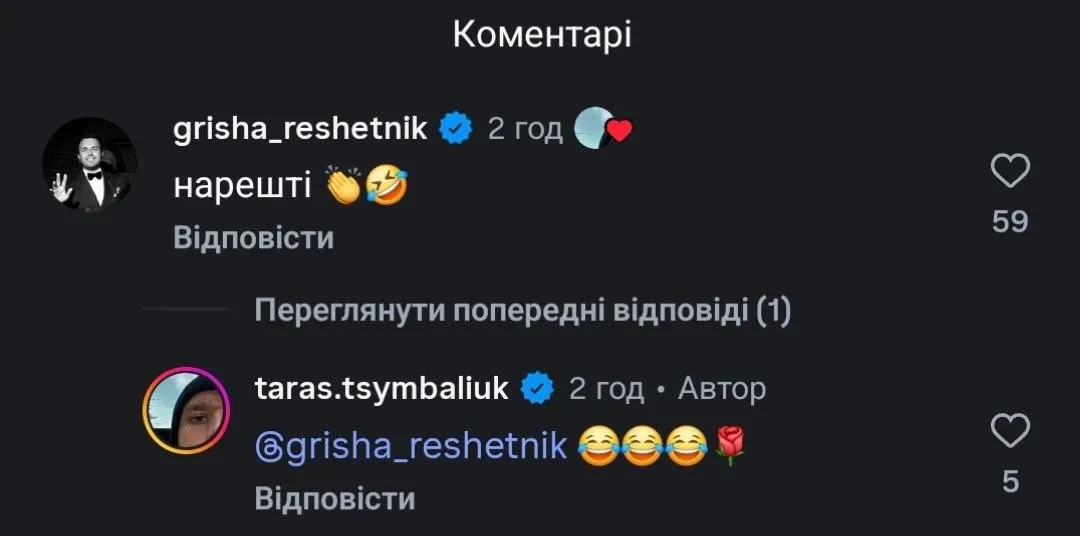 На публікацію свого зіркового колеги відреагував Григорій Решетнік, ведучий популярного телевізійного шоу «Холостяк», в останньому сезоні якого в головній ролі знімався Цимбалюк.