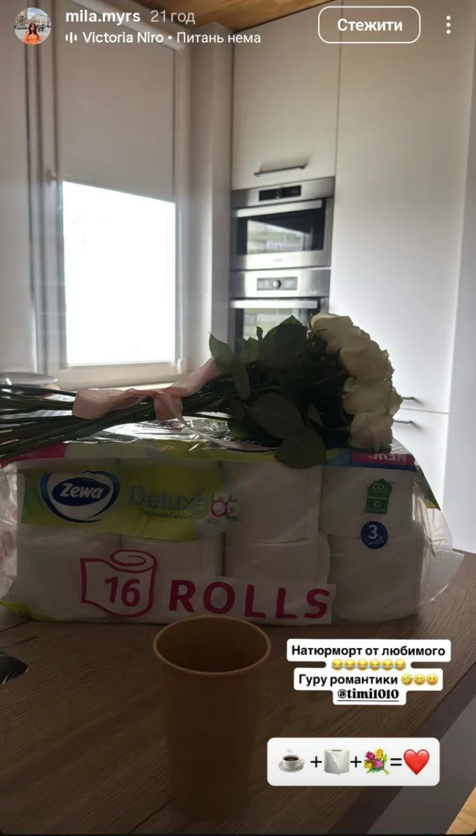 Артем Мілевський зробив незвичний подарунок своїй дівчині Тамілі. Кохана легендарного екс-форварда Динамо та збірної України опублікувала в сторіс на своїй сторінці в соціальній мережі Instagram фото, на якій букет квітів лежить на пачках туалетного паперу.