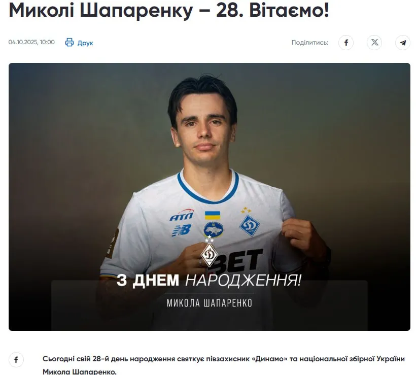 Шапаренку – 27: футболіста яскравим відео привітала УАФ, а от Динамо оконфузилося вітаючи свого гравця