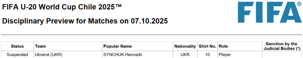 На сайті Міжнародної федерації футболу (ФІФА) з’явилась інформація, що півзахисник молодіжної збірної України (U-20) Геннадій Синчук пропустить матч 1/8 фіналу ЧС проти Іспанії.