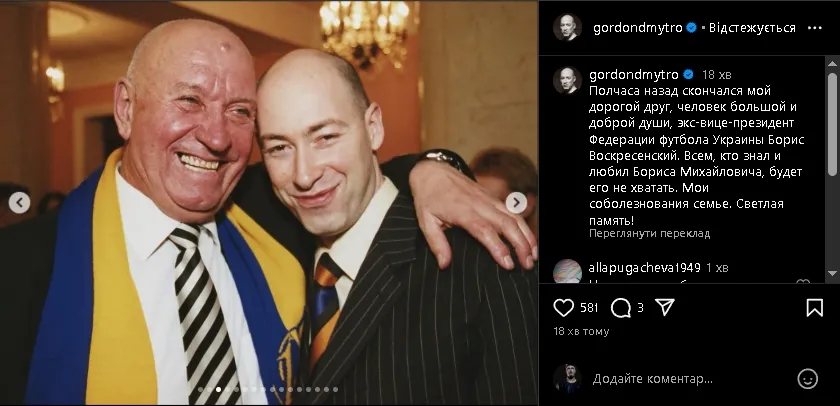 Український журналіст Дмитро Гордон у своєму Instagram повідомив про смерть Бориса Воскресенського — відомого спортивного функціонера та колишнього віцепрезидента Федерації футболу України, якому було 86 років.