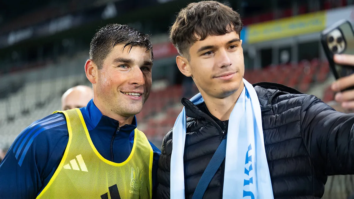 Руслан Маліновський (ліворуч) із вболівальником. Фото: УАФ