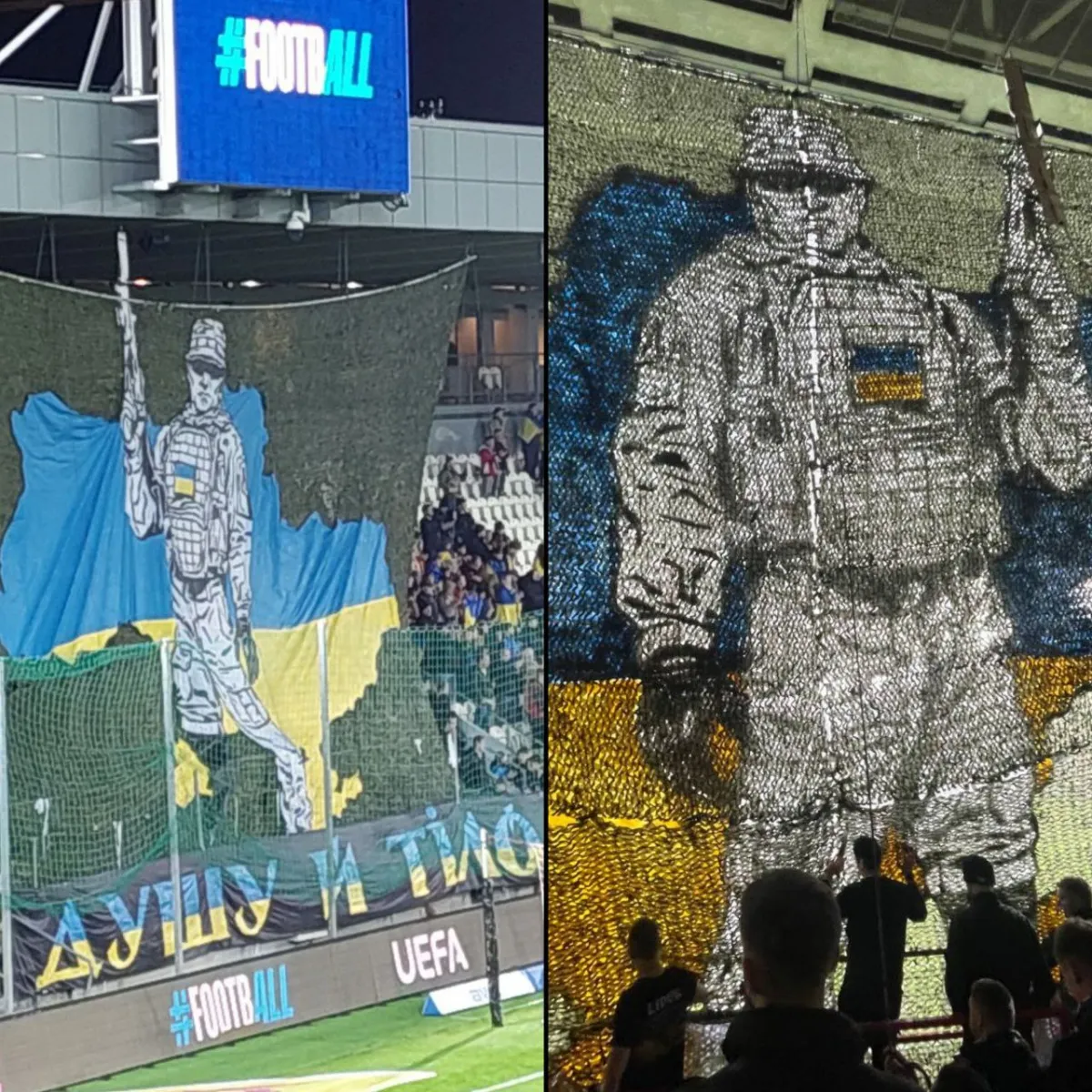 Перед стартовим свистком поєдинку четвертого туру відбору на чемпіонат світу 2026 року між національними збірними України та Азербайджану на трибуні з активними фанами синьо-жовтої дружини розгорнули велетенський банер із зображенням українського військового зі зброєю в руках.