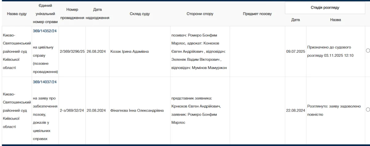 Крім кримінального розслідування, у Києво-Святошинському районному суді Київської області розглядається цивільна справа № 369/14352/24 за позовом Ромеро Бонфіма Марлоса до Вадима Вікторовича Зеленяка та Мамуржона Мумінова.