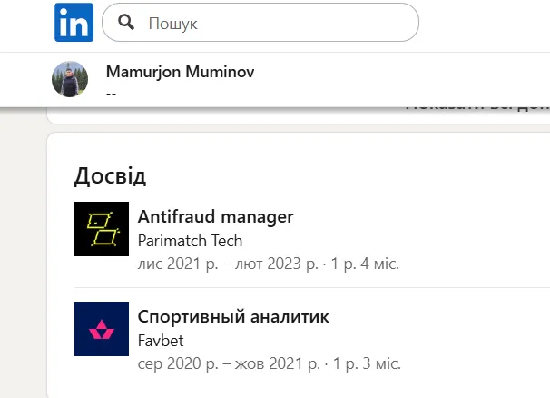 Публічні відомості про Мумінова Мамуржона відсутні, проте в соцмережі Linkedin є профіль з таким самим ім’ям, де зазначено, що особа з таким же ім’ям працювала спортивним аналітиком у Favbet та менеджером по боротьбі з шахрайством в Parimatch Tech.