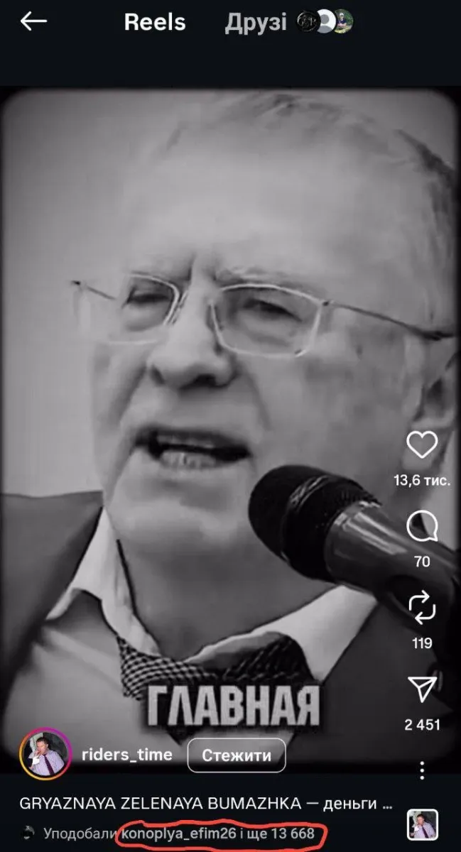Користувач соціальної мережі Instagram Юхим Конопля, ім'ям та прізвищем повністю ідентичними до тих, що має оборонець донецького Шахтаря та національної збірної України та ще й з фото футболіста на аватарці, поставив лайк під відео із одним з головних пропагандистів Кремля нині вже покійним політиком Володимиром Жириновським.