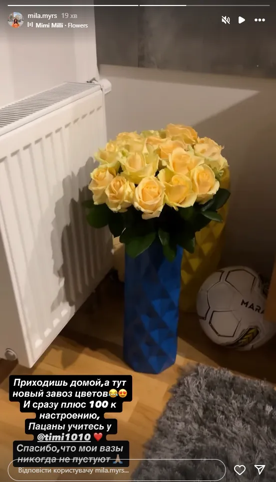 «Приходиш додому, а тут нова доставка квітів. І відразу плюс 100 до настрою. Хлопці, вчіться у Артема Мілевського. Дякую, що мої вази ніколи не пустують», – написала жінка.