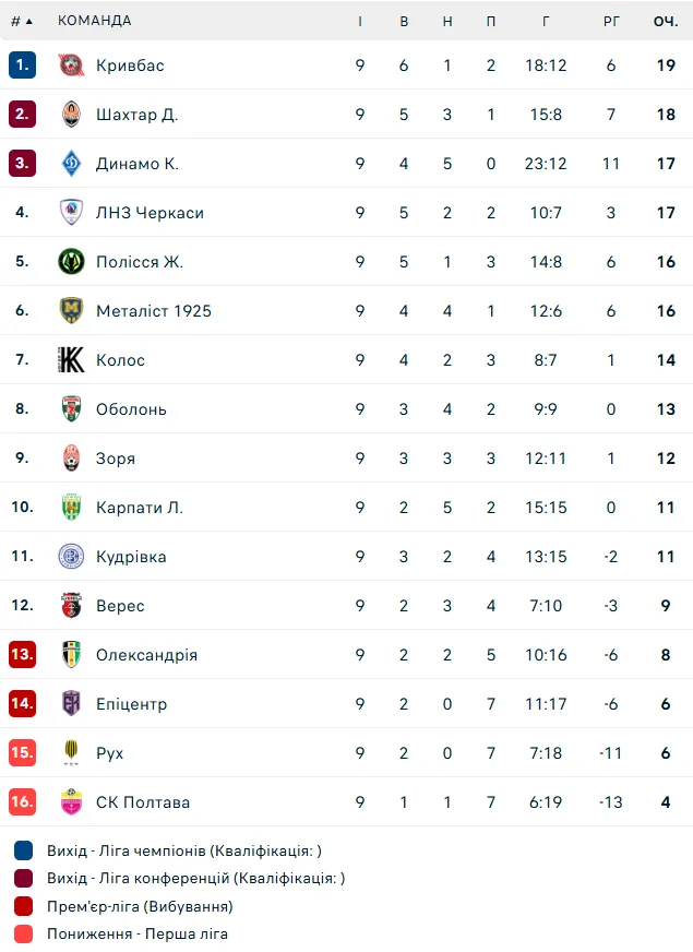 Турнірна таблиця УПЛ після дев’ятого туру: Кривбас вийшов у лідери, а які місця у Динамо та Шахтаря