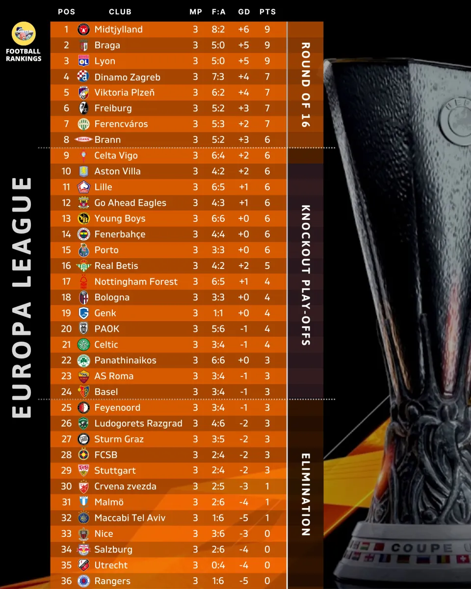За підсумками туру оновилася турнірна таблиця Ліги Європи. Ноттінгем Форест розташовується в ній на 17-й сходинці, а Рома – на 23-й.