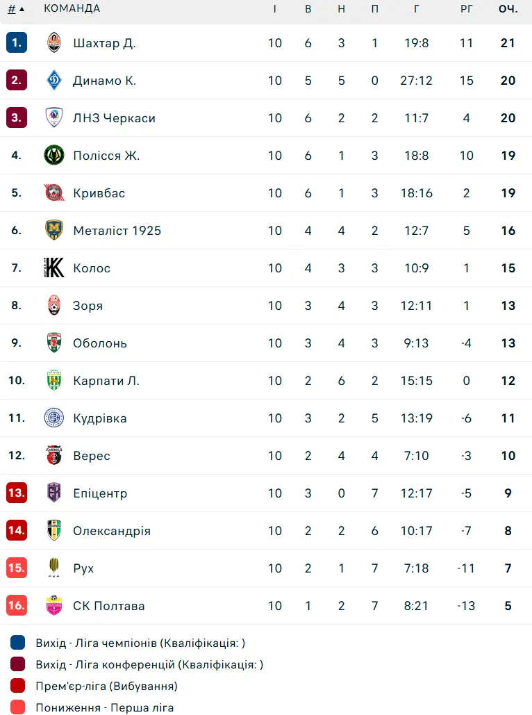 Турнірна таблиця УПЛ після 10-го туру: Шахтар і Динамо розгромили суперників 4:0 – хто лідер