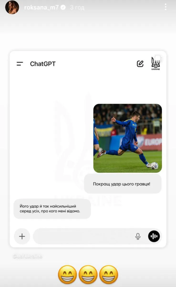 Роксана Малиновська вирішила дізнатись у штучного інтелекту, чи можна покращити удар свого чоловіка Руслана, який і так стріляє з лівої ноги, немов з гармати.