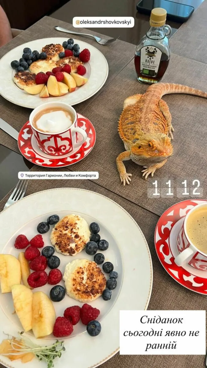 На іншому кадрі - затишний домашній сніданок: сирники з ягодами, яблука, кава та кленовий сироп. На столі навіть з’явився їхній домашній улюбленець - бородата агама.