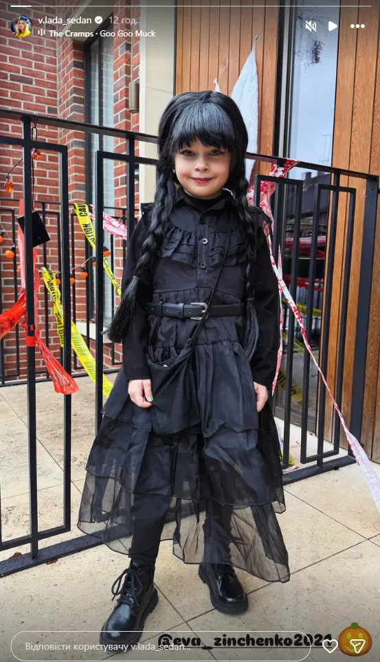Не менш оригінально виглядала і донька Влади Седан та Олександра Зінченка. Єва з’явилася у впізнаваному образі Венздей Адамс, продовжуючи моду на героїню з популярного серіалу Netflix.