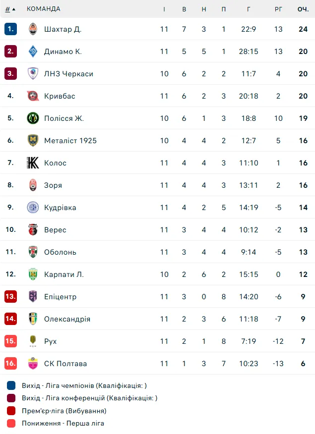 - Шахтар зміцнив відрив від Динамо у турнірній таблиці до чотирьох очок і наразі очолює чемпіонат. Команда Олександра Шовковського йде другою.