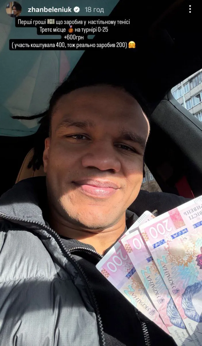 «Перші гроші, що заробив у настільному тенісі. Третє місце на турнірі 0-25. +600 гривень. Участь коштувала 400 гривень, тож реально заробив 200 гривень», - написав спортсмен в Instagram, додавши фото з турніру.