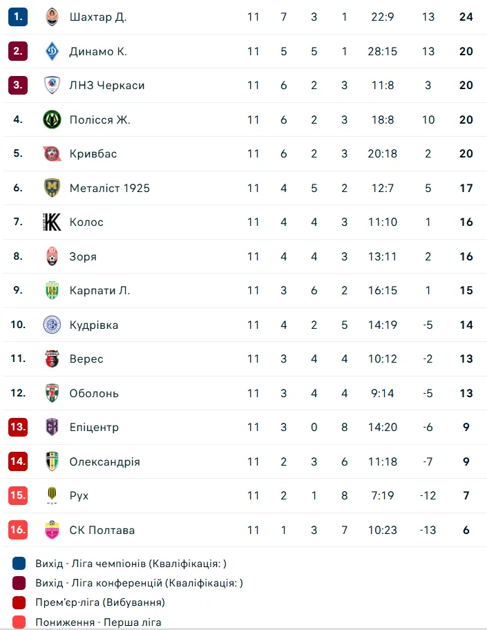 Турнірна таблиця УПЛ після 11-го туру: Шахтар – одноосібний лідер, Полісся та ЛНЗ не змогли випередити Динамо