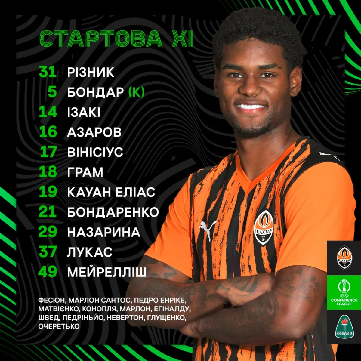 Пресслужба Шахтаря оприлюднила стартовий склад донецької команди на поєдинок третього туру основного етапу Ліги конференцій проти ісландського Брейдабліку.