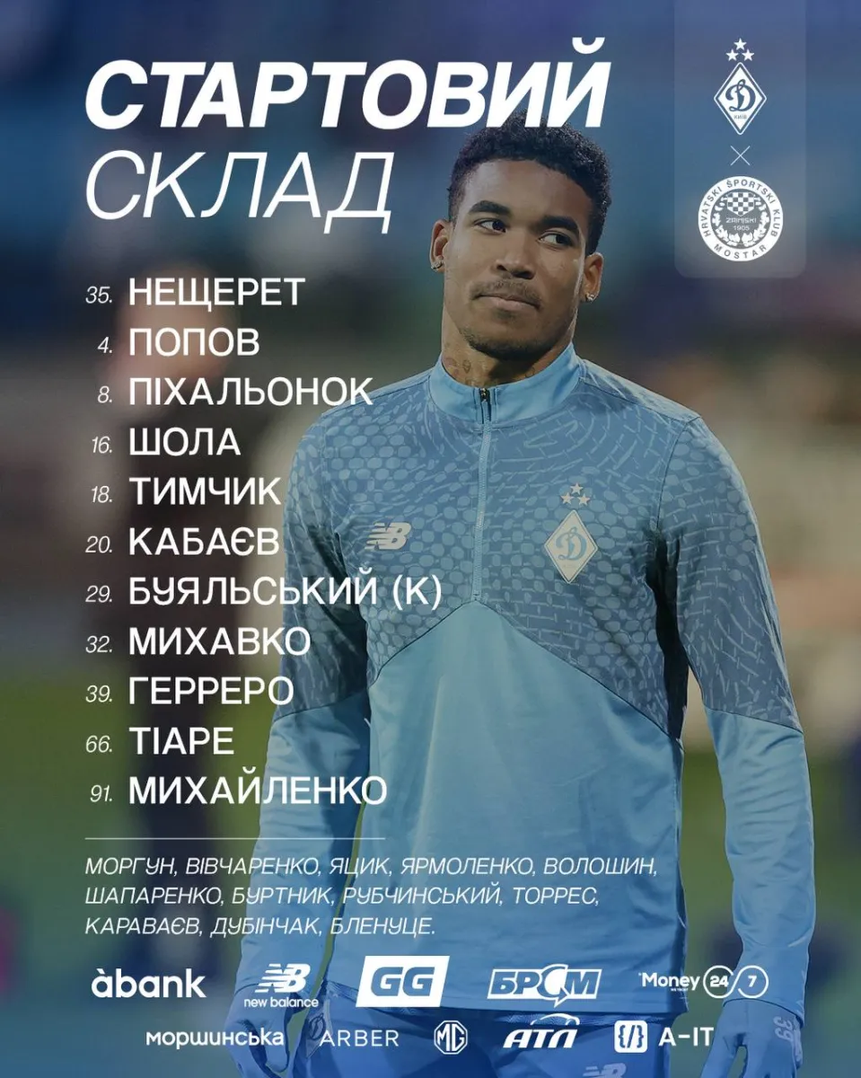 Пресслужба київського Динамо оприлюднила стартовий склад команди Олександра Шовковського на поєдинок з боснійським Зрінськи в рамках третього туру основного етапу Ліги конференцій.