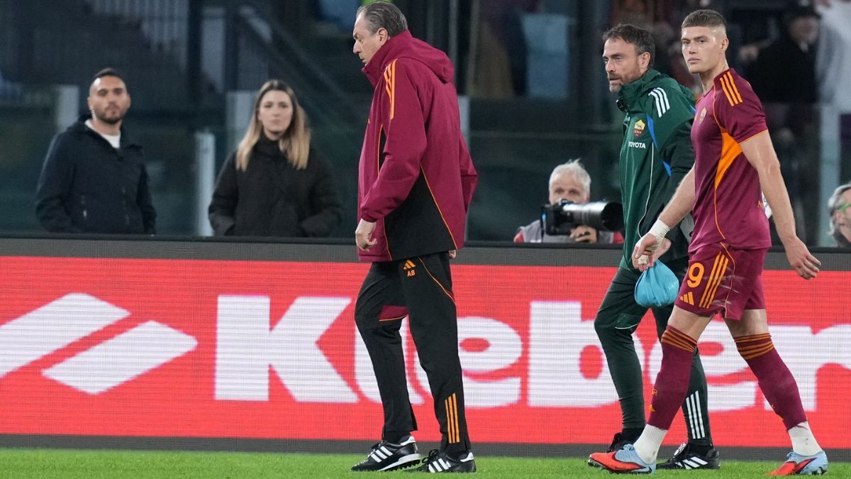 Артем Довбик покидає поле у супроводі лікарів. Фото: x.com/RomaSpace