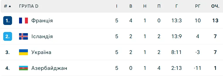 - Після п’ятого туру у групі D національна команда України має в активі сім залікових пунктів та посідає третє місце у квартеті. Лідирують – французи, які вже вийшли на ЧС-2026, Ісландія – друга, а на останній позиції знаходиться збірна Азербайджану.