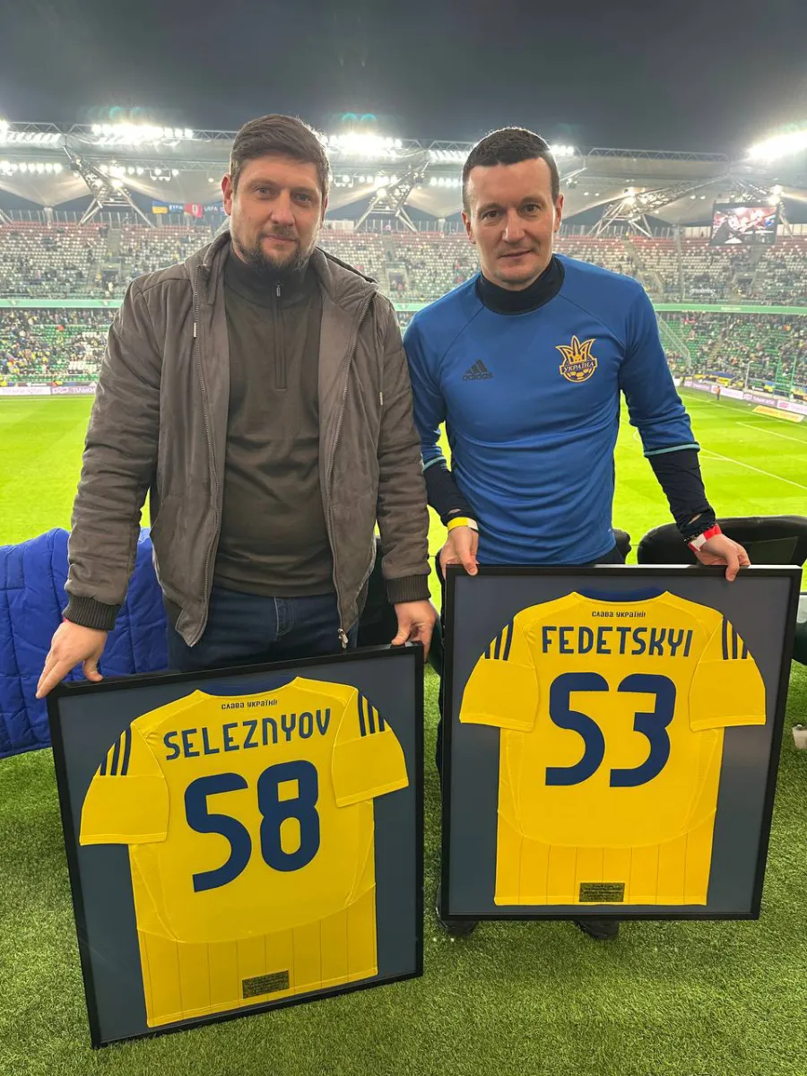 Президент Української асоціації футболу Андрій Шевченко вручив пам’ятні футболки двом екс-гравцям національної збірної – Євгену Селезньову та Артему Федецькому.