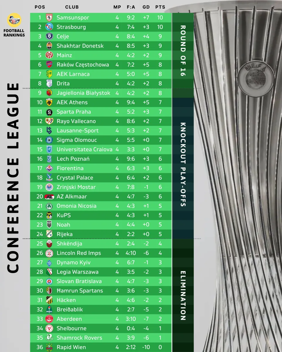 Після четвертого туру Ліги конференцій Шахтар посідає четверте місце в загальній турнірній таблиці єврокубка, а Динамо – 27-ме.