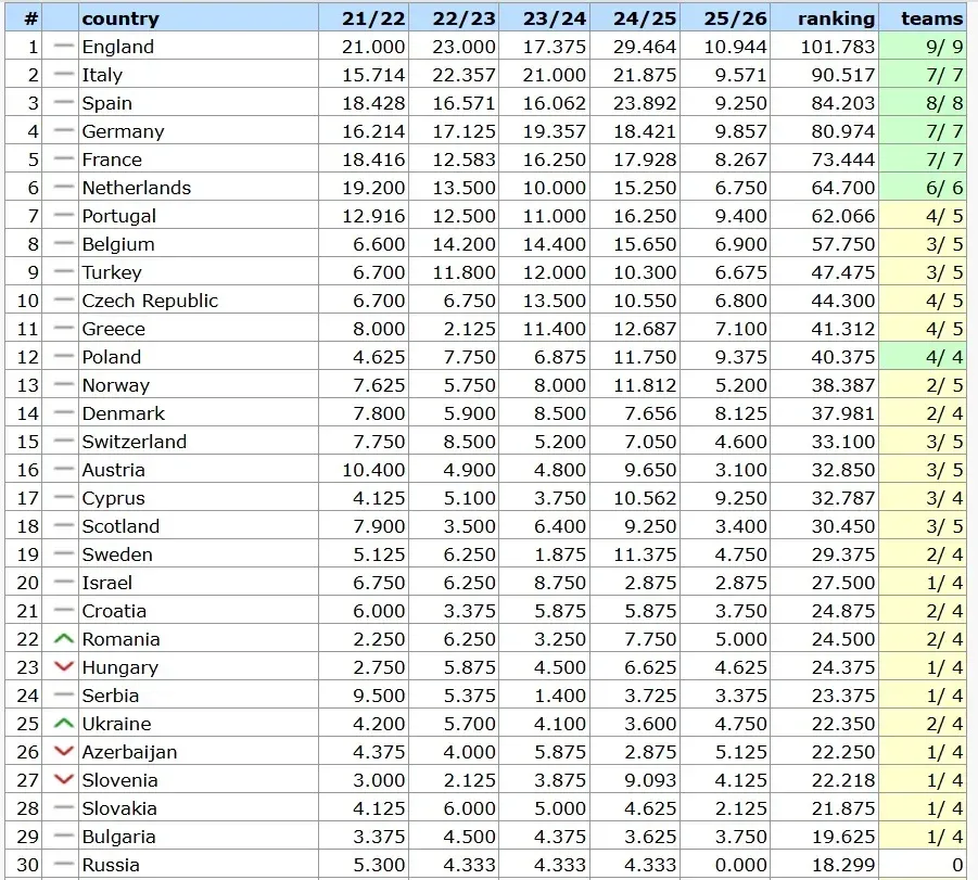 У п'ятирічному рейтингу Україна має 22,350 очка. Цей показник дозволив обійти Азербайджан та Словенію, піднявшись на 25-ту позицію. Обидва суперники залишилися без очок: у Азербайджану Карабах поступився Наполі у Лізі чемпіонів (0:2), а у Словенії Цельє програв чеській Сігмі у Лізі конференцій (1:2).