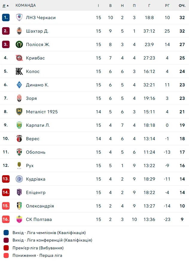 Турнірна таблиця УПЛ після 15-го туру: Шахтар – другий, несподіваний лідер і сьоме місце Динамо