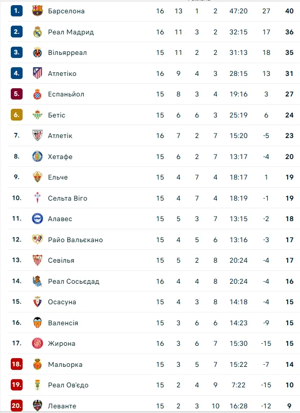 - Жирона провела 16 матчів, набрала 15 очок та посідає 17-те місце в турнірній таблиці Ла Ліги.