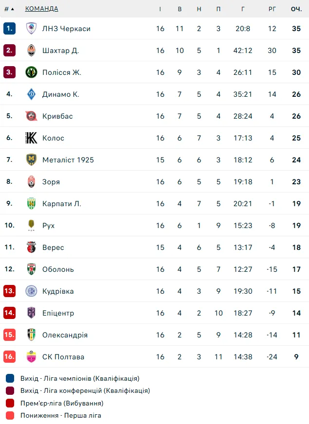 Турнірна таблиця УПЛ після 16-го туру