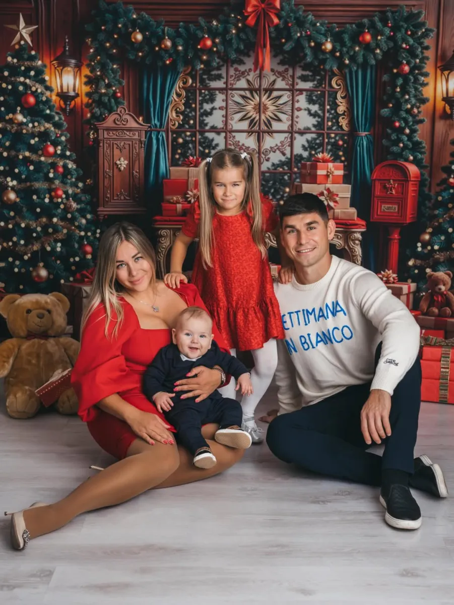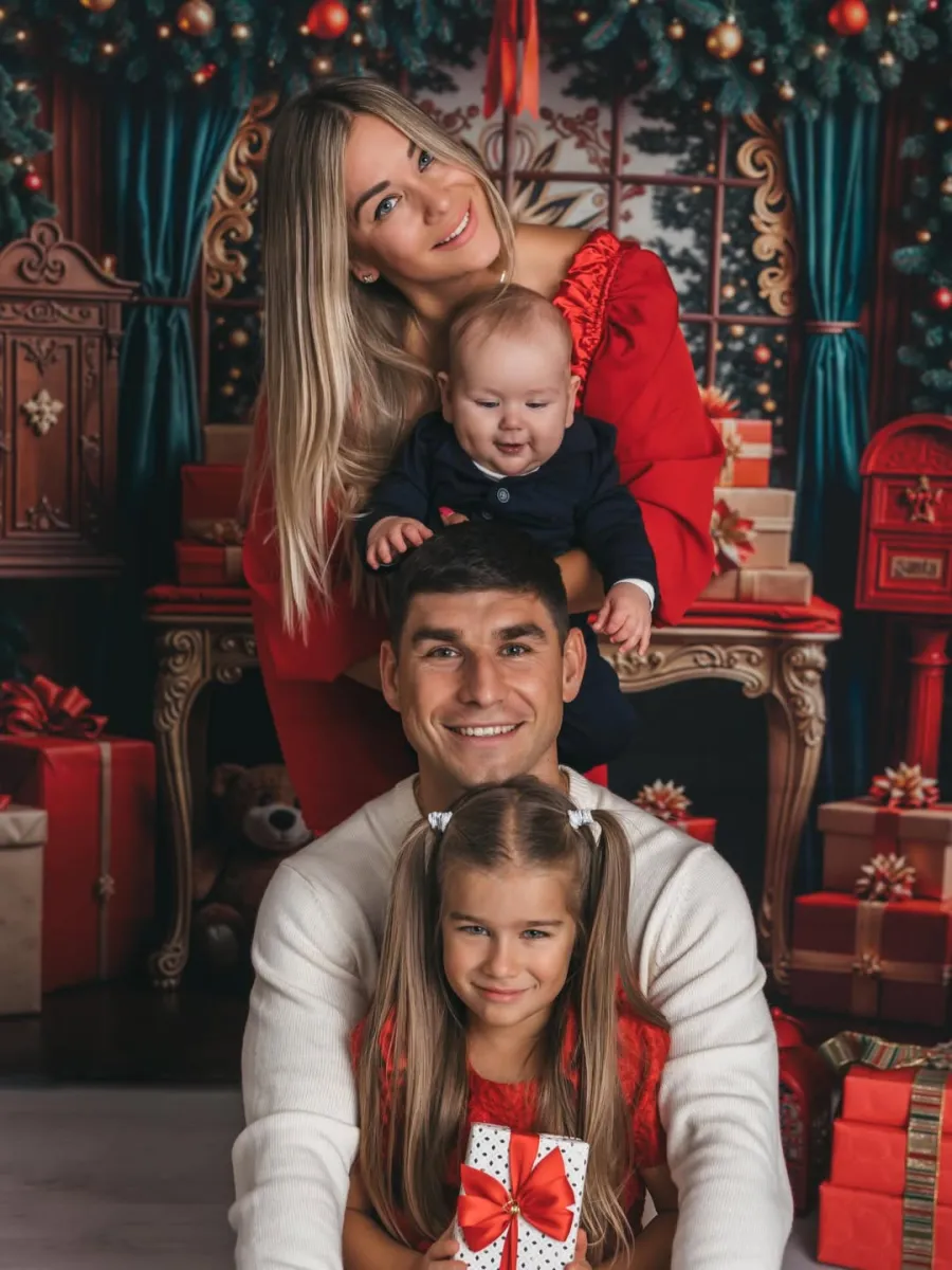 На фото родина позує на фоні яскравих новорічних декорацій - ялинки, подарункових коробок та святкового реквізиту. Святкові образи виконані у класичних різдвяних кольорах, а настрій кадрів передає затишок і родинне тепло.