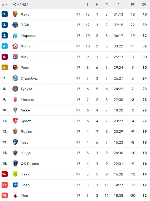 - ПСЖ під керівництвом іспанського головного тренера Луїса Енріке зіграв 17 поєдинків, набрав 39 очок та посідає друге місце в турнірній таблиці елітного французького дивізіону з відставанням від Ланса в один заліковий пункт.